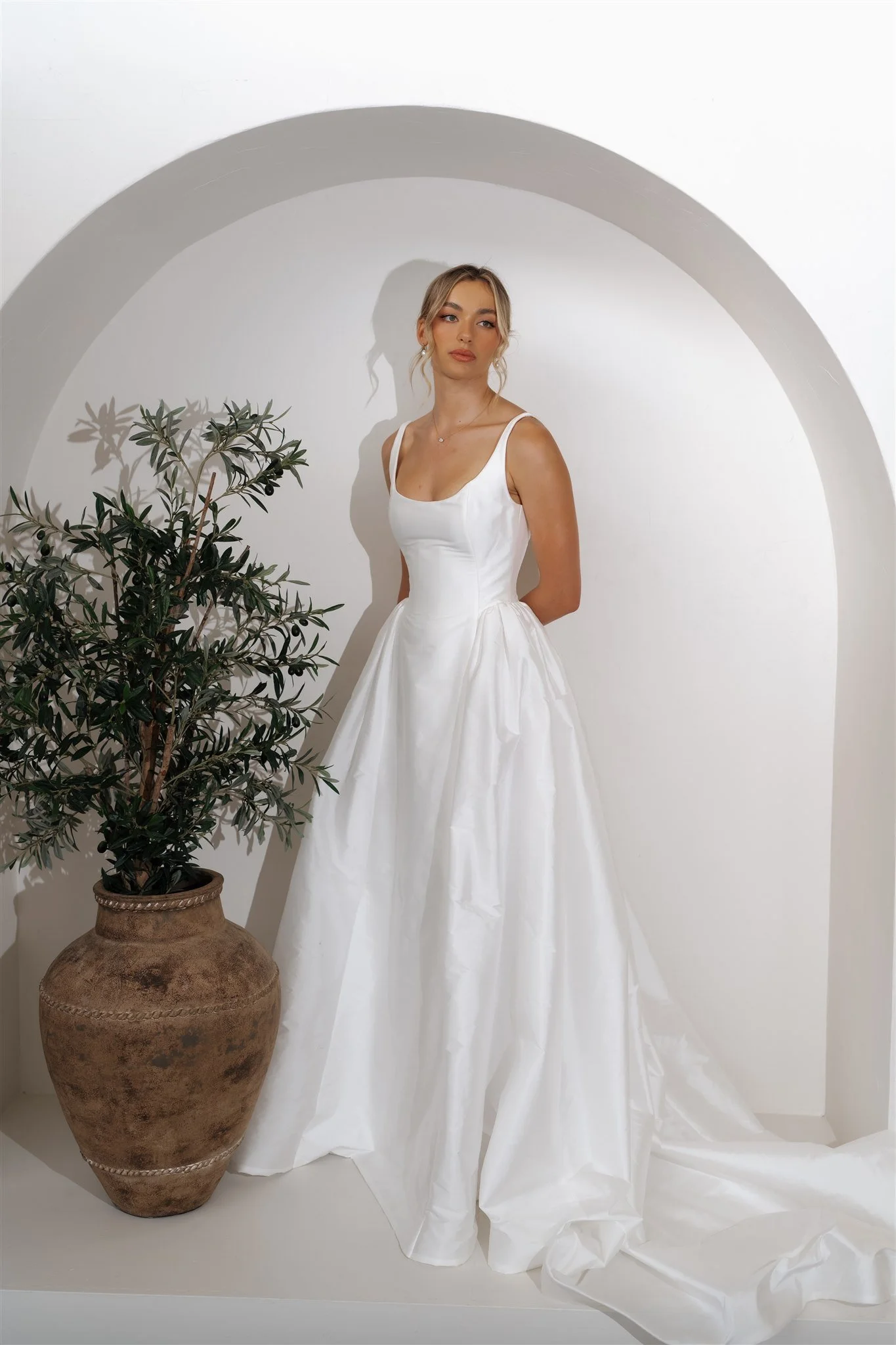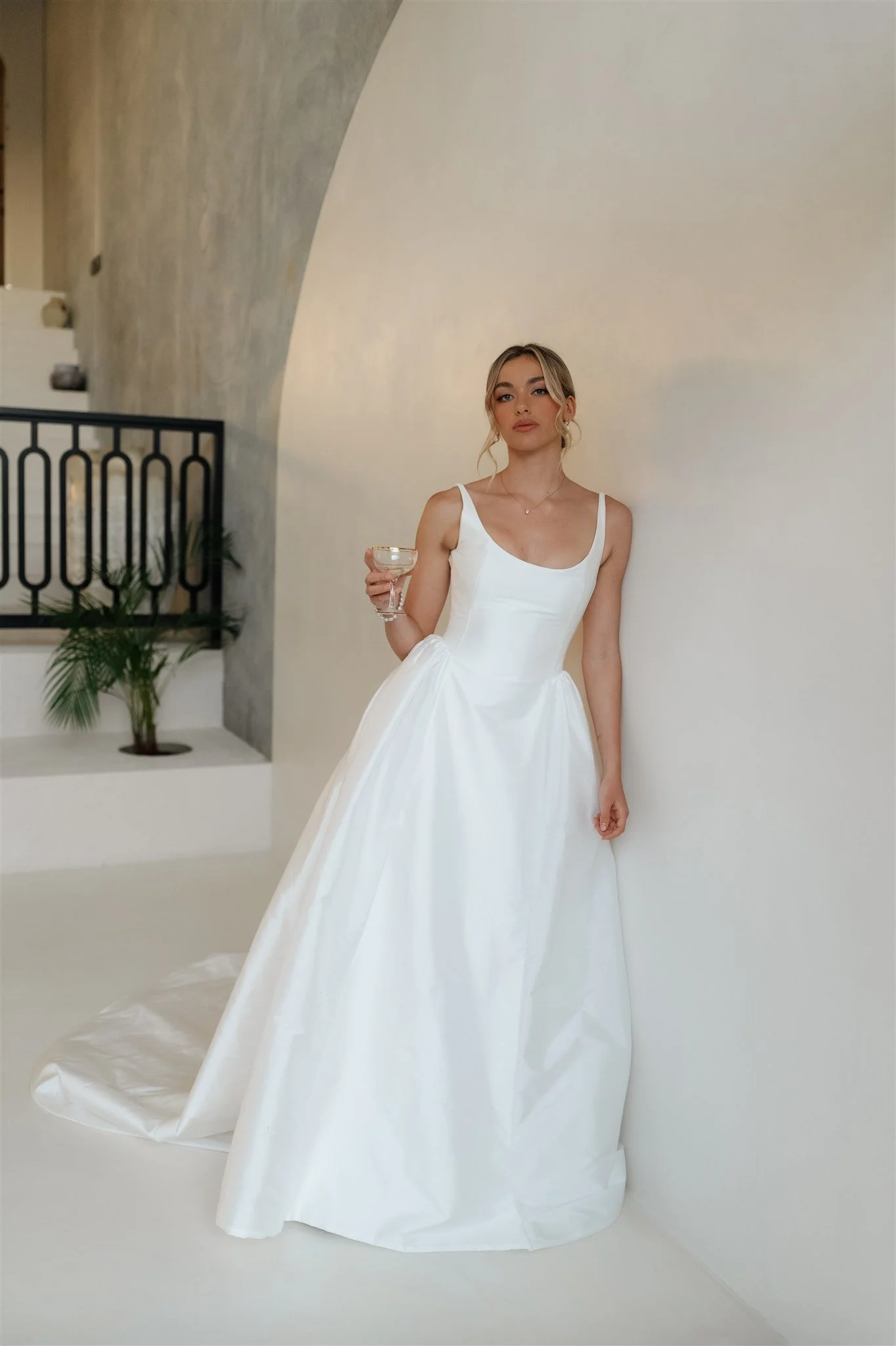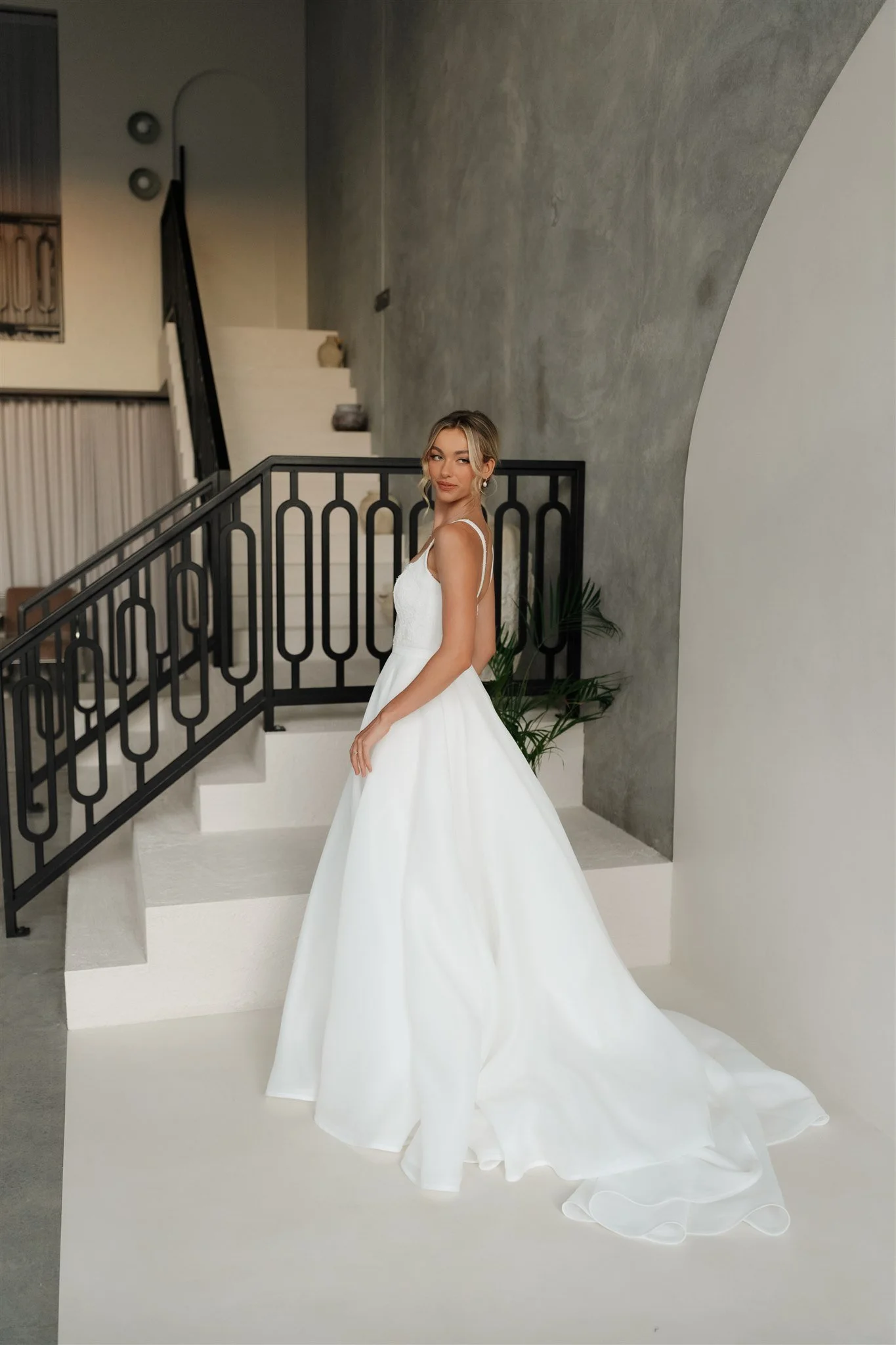 A perfect choice for brides seeking a modern wedding gown with a 50’s inspired silhouette, minimal lines and understated sophistication.