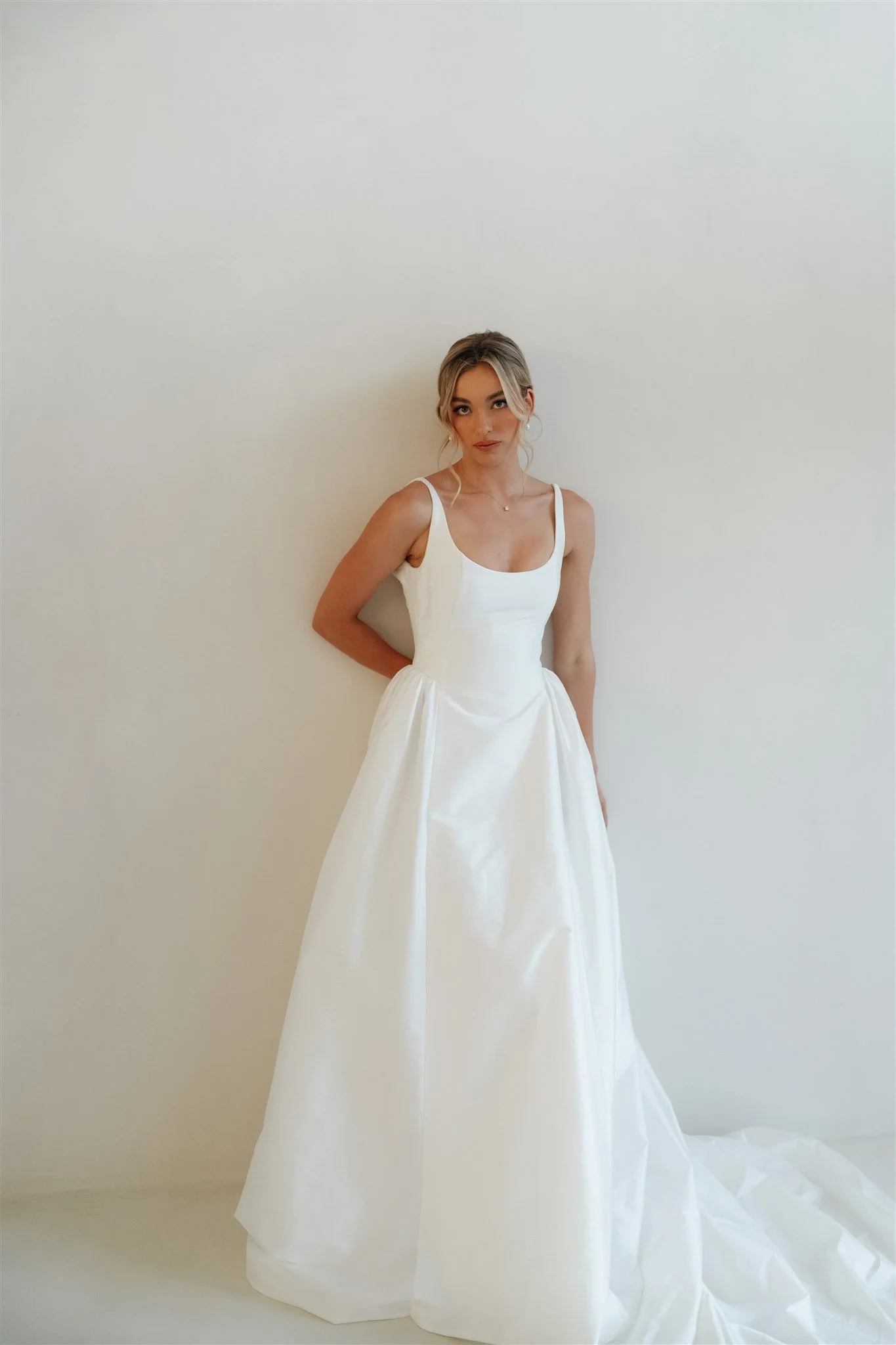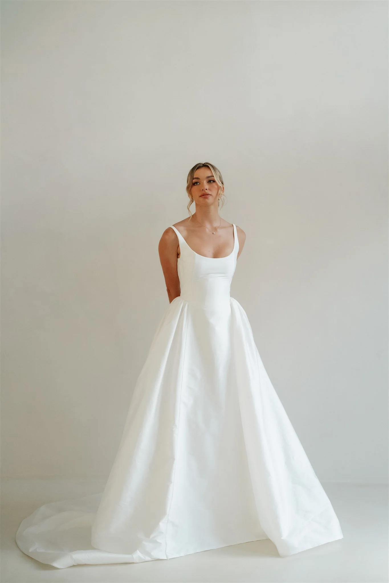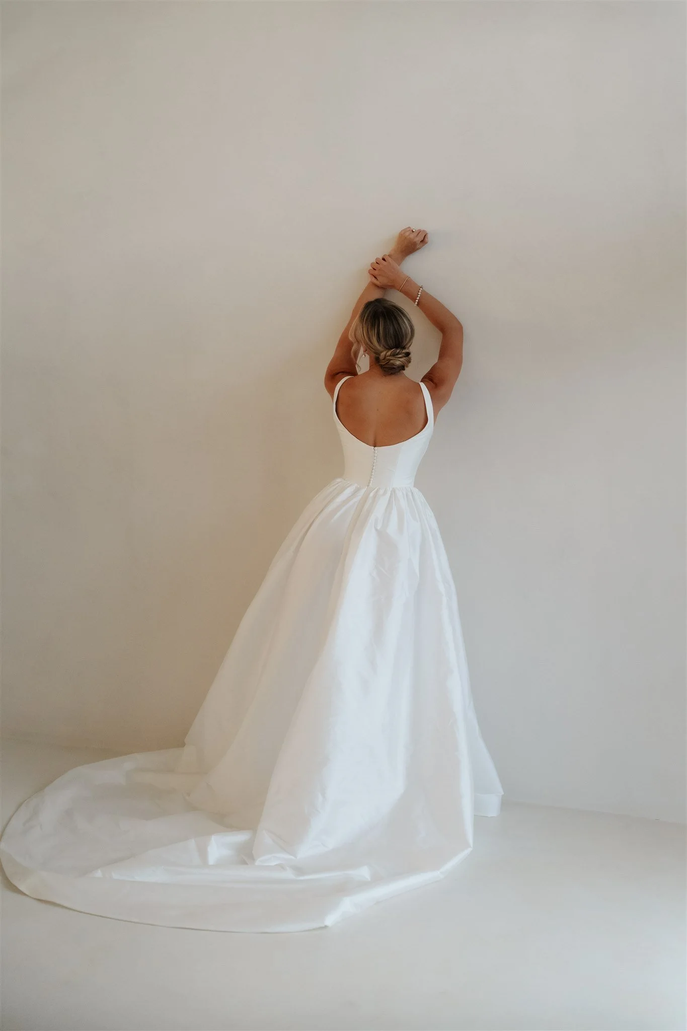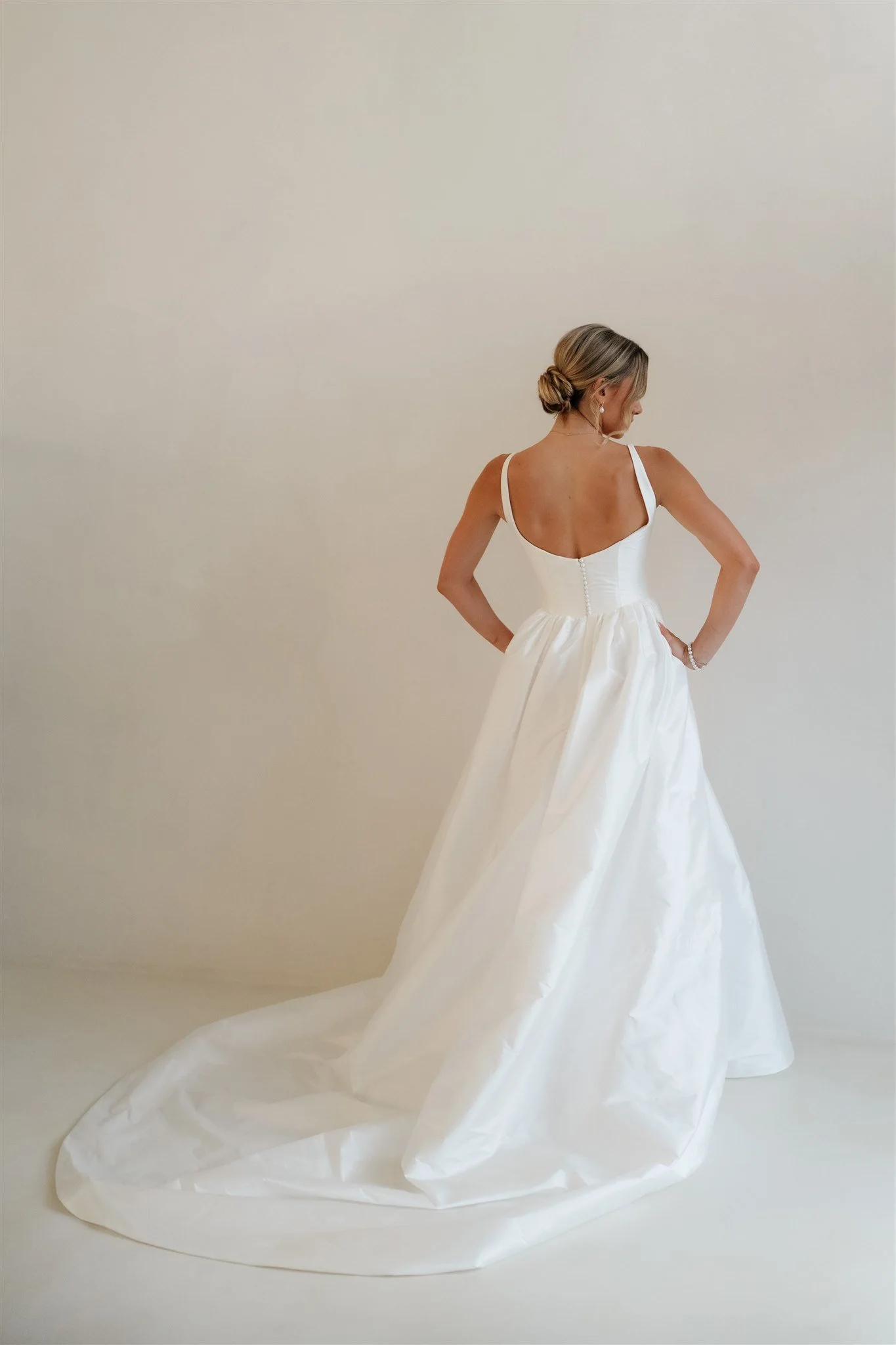 A perfect choice for brides seeking a modern wedding gown with a 50’s inspired silhouette, minimal lines and understated sophistication.